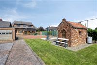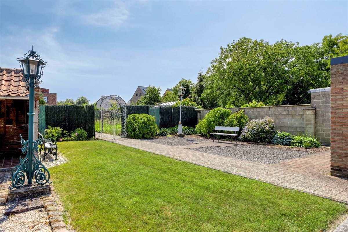 - Achtertuin: zuidelijk georiënteerd en uitgerust met een betegeld, overdekt terras en zitruimte uitgevoerd met rustieke materialen.