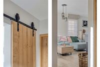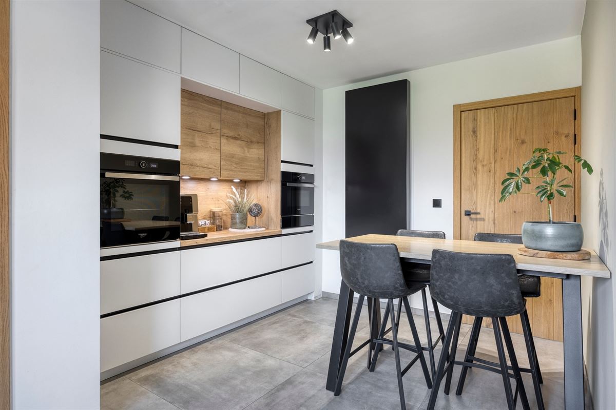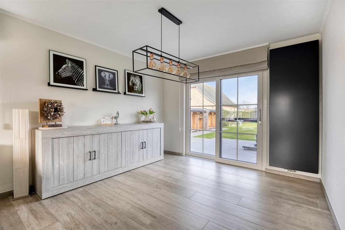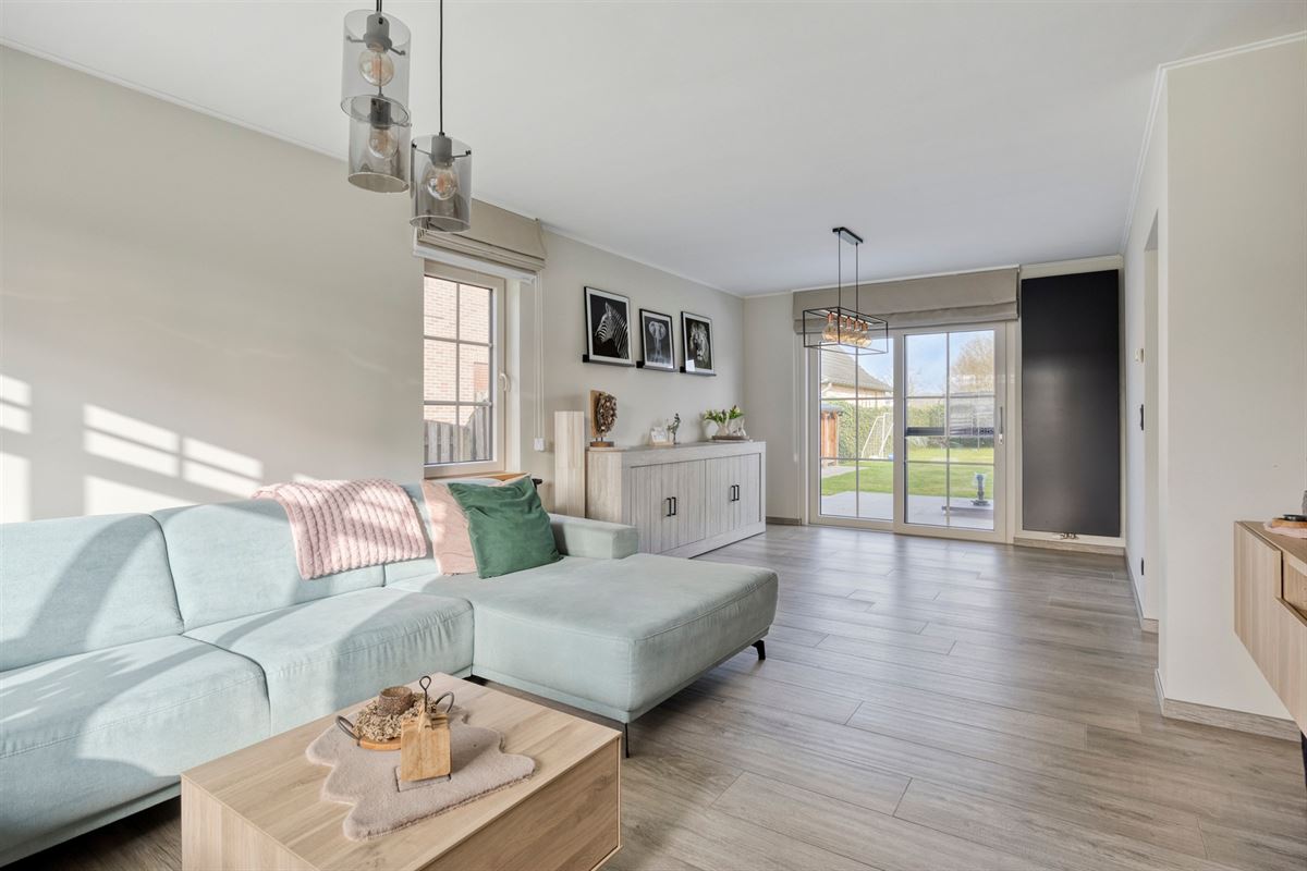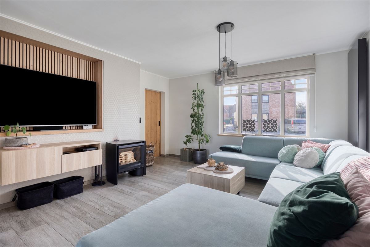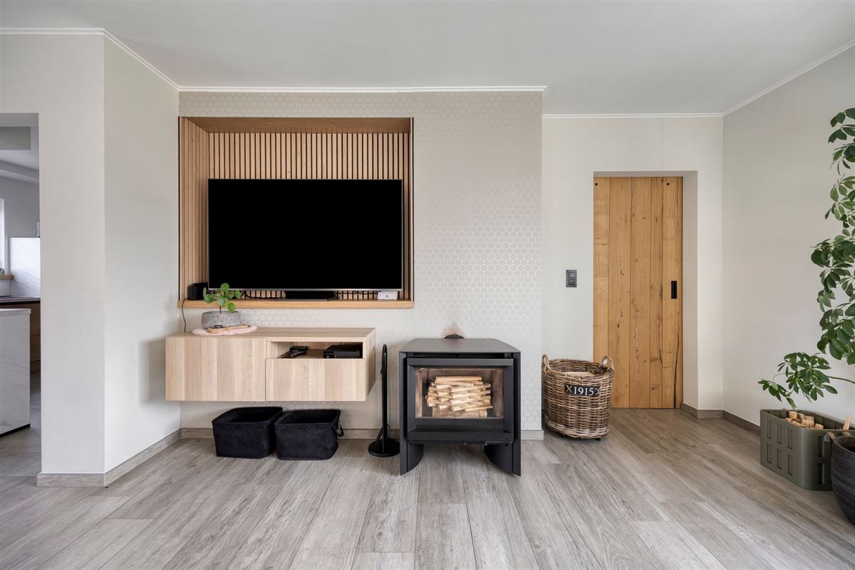 - Lichtrijke leefruimte met keramische tegel met parketlook en grote raampartijen die zorgen voor een aangename lichtinval. De ruimte is voorzien van een kachel (2023) en geeft via een schuifpui rechtstreeks toegang tot het terras aan de achterzijde.