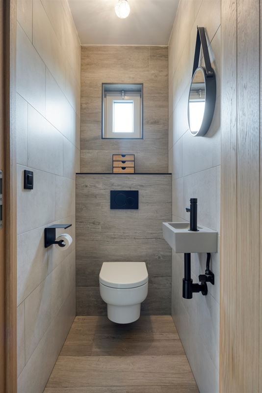 - Afwerking met keramische tegelvloer met parketlook, grijze tegelvloer en laminaatvloer.