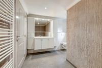• Badkamer, afgewerkt met een donkere tegelvloer, uitgerust met een wasmeubel met wastafel, kolomkasten, spiegelkast, inloopdouche en toilet.
