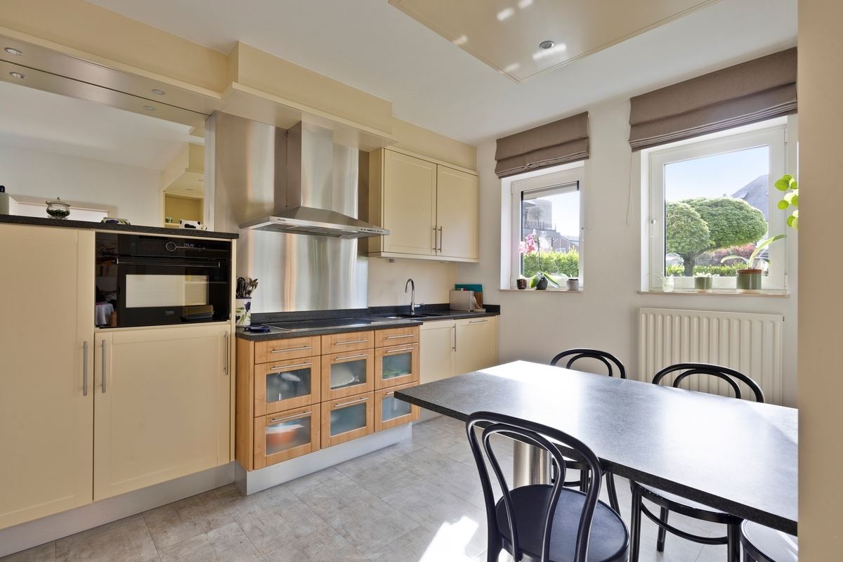 • Volledig geïnstalleerde keuken voorzien van een eethoek en keramisch kookvuur met dampkap, oven, vaatwasser, koelkast en spoeltafel.