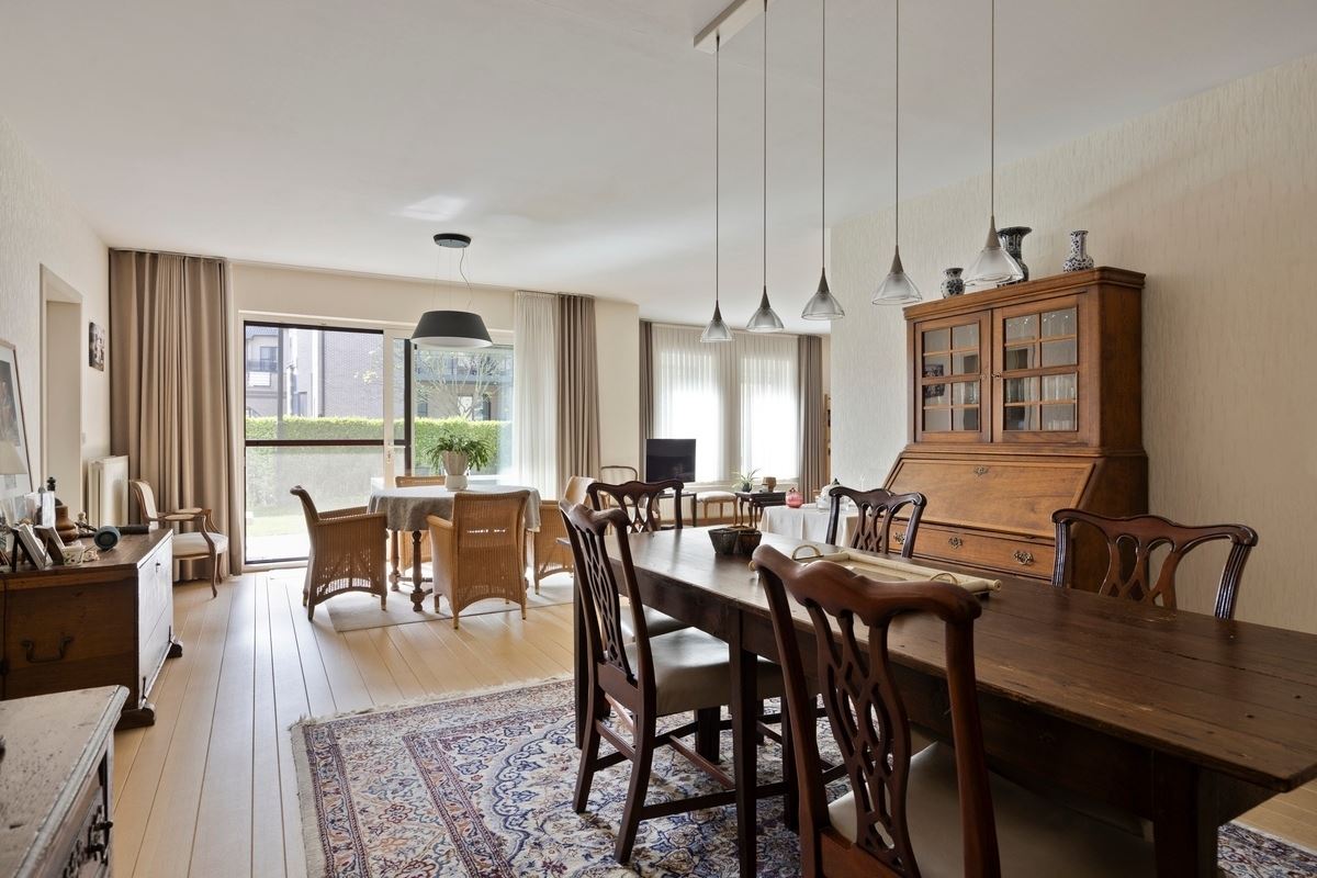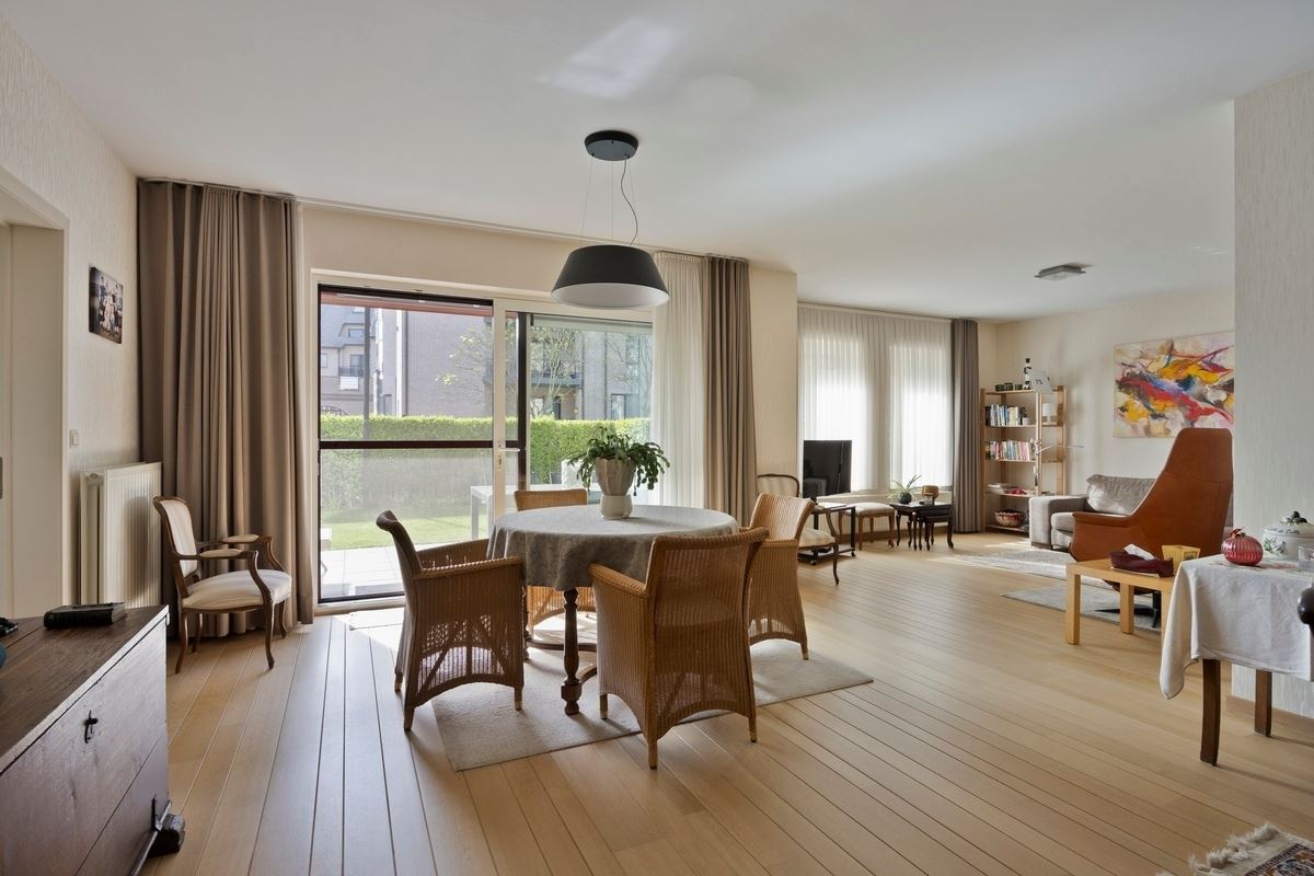 Uitzonderlijk ruim, gelijkvloers 2-slaapkamer appartement met terras en tuintje, zonnepanelen en inpandige garagebox gelegen vlakbij het centrum van Maaseik.