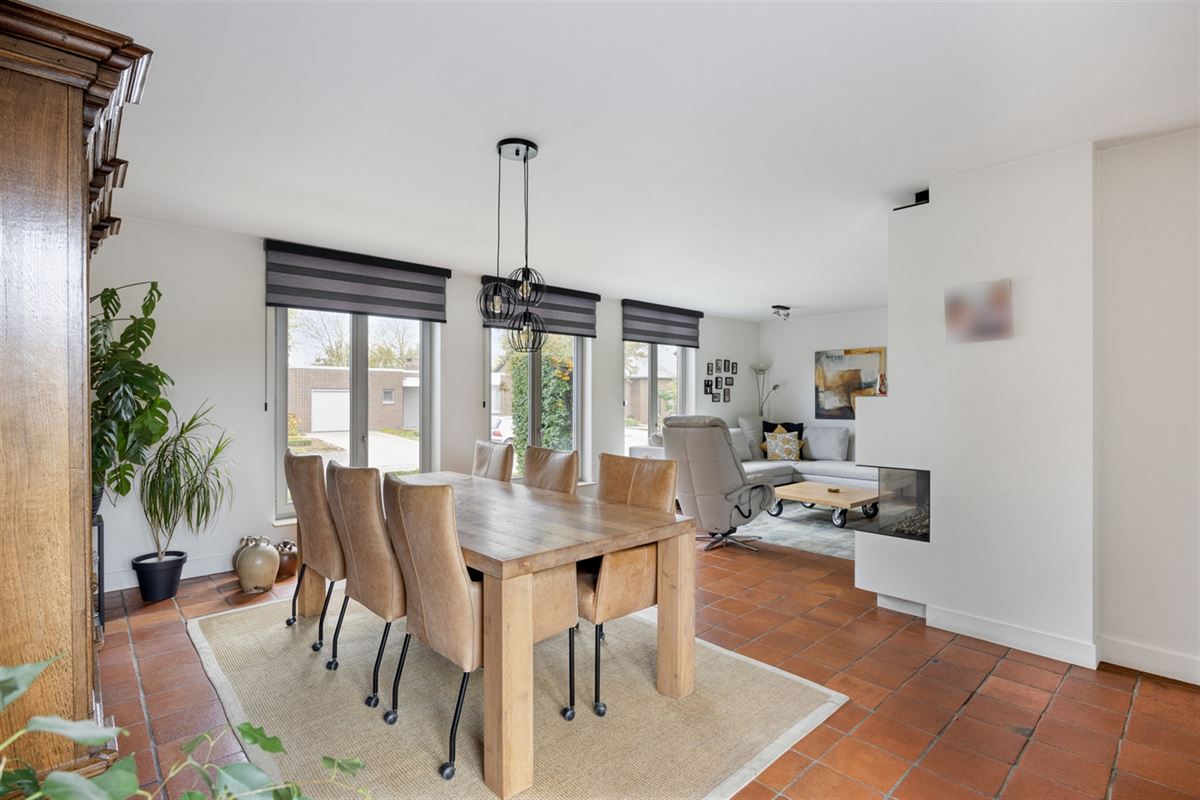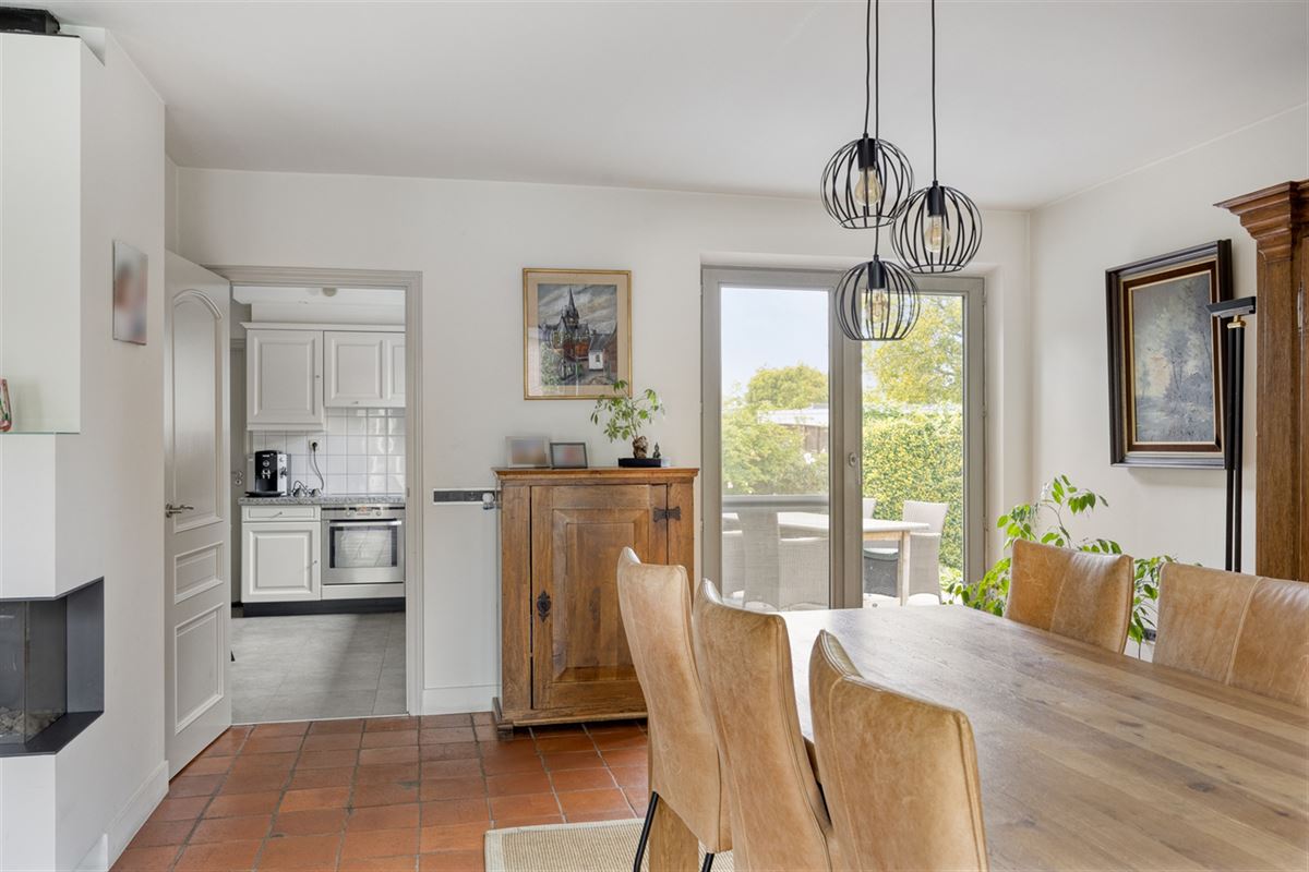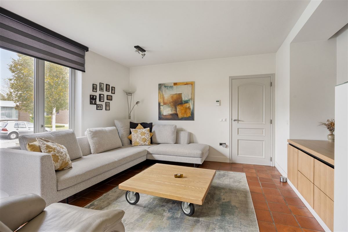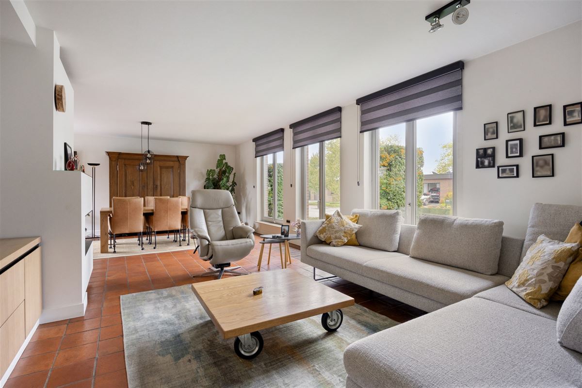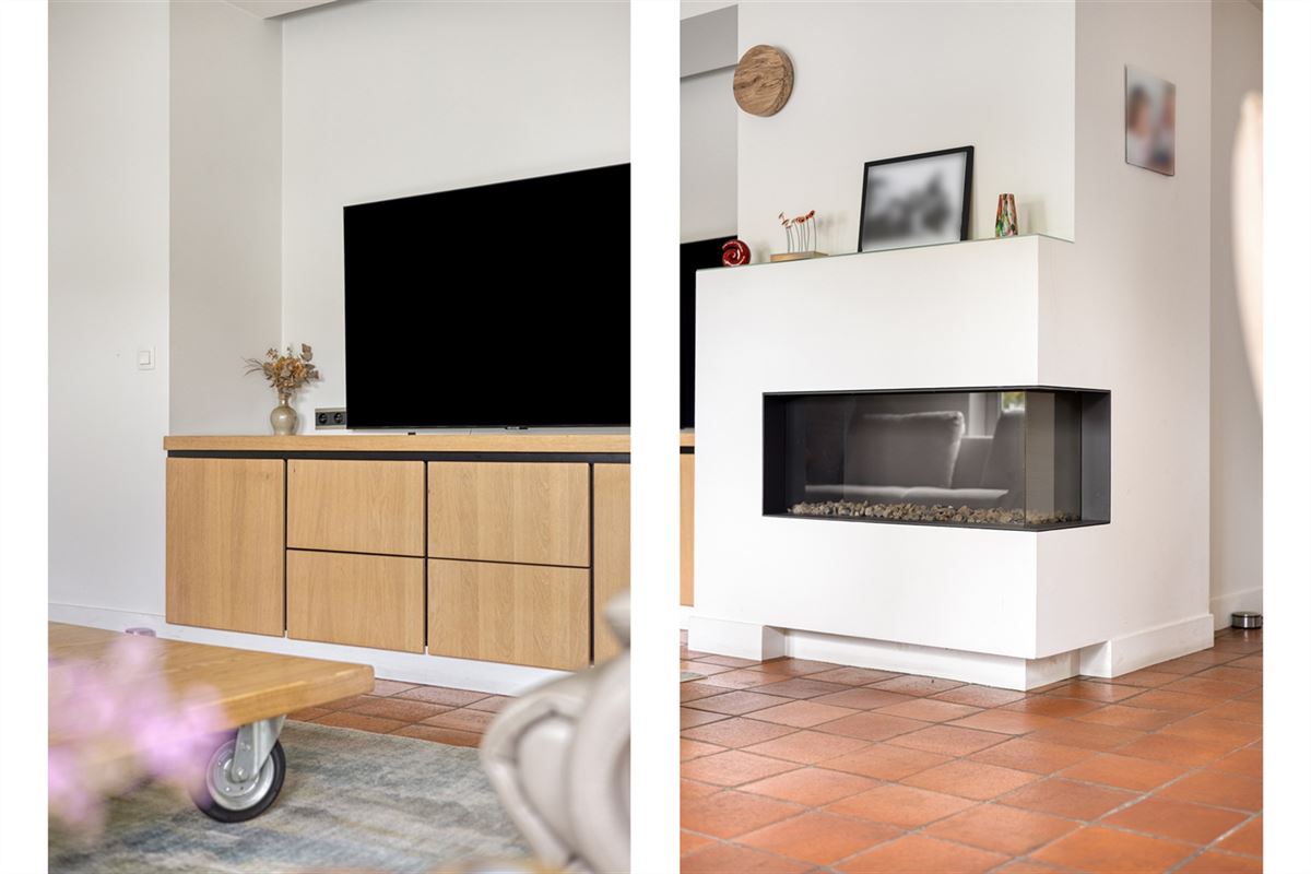 • Leefruimte met gebakken tegelvloer, gezellige gashaard, convectoren en grote raampartijen die zorgen voor veel lichtinval en een aangenaam woongevoel. Via de leefruimte is er toegang tot de keuken en het verhoogde terras.