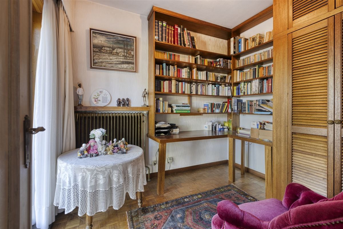 - Slaapkamer 2: gelegen aan de voorzijde en momenteel ingericht als bibliotheek, voorzien van raampartijen, verwarming en ingebouwde kast.