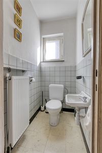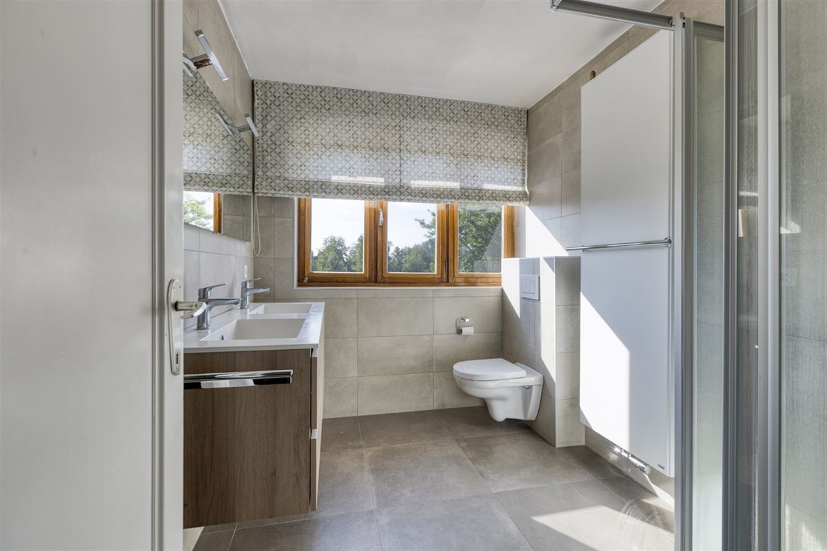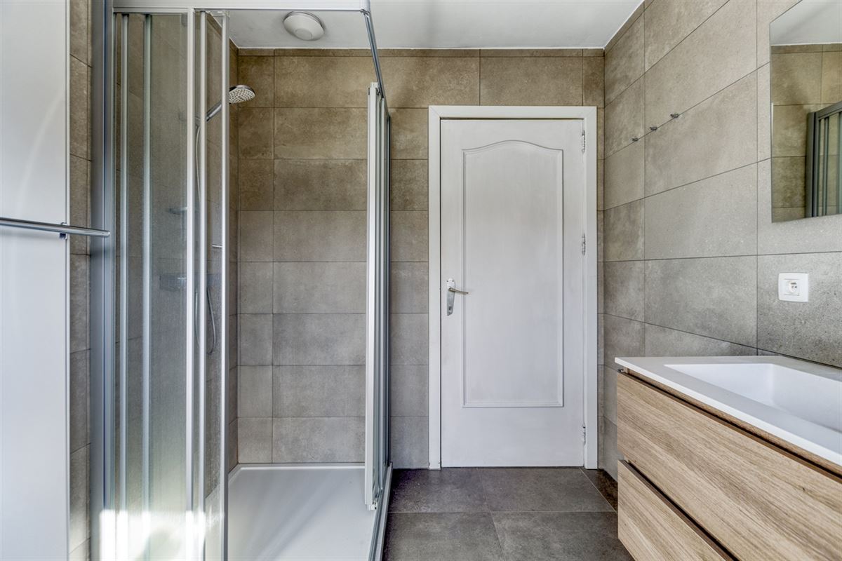 - Badkamer (volledig vernieuwd en betegeld) uitgerust met dubbele wastafel met wasmeubel, douchecabine, toilet en hangradiator. Vanuit de badkamer geniet men eveneens van een mooi zicht over de achtertuin.