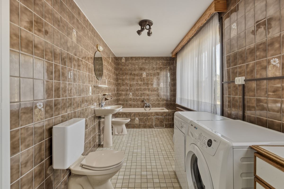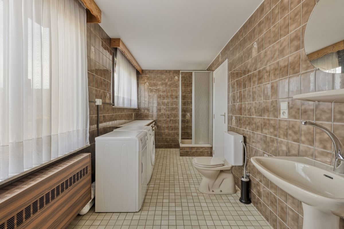 - Badkamer: volledig betegeld en voorzien van een ligbad, douche, wastafel en aansluiting voor wasmachine en droogkast.