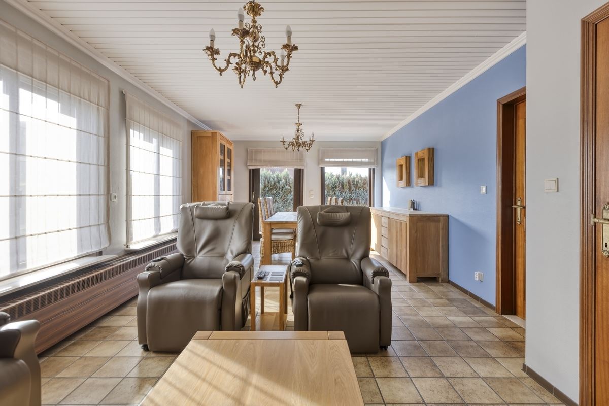 - Woonkamer met raampartijen en zicht op de achtertuin, toegang tot het verhoogde terrasje aan de achterzijde.